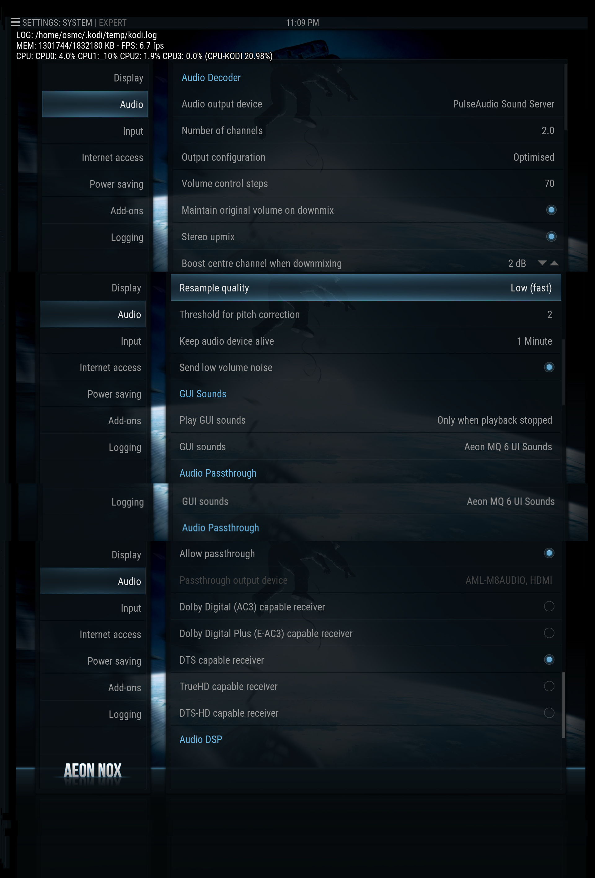 Please note, once the glitching started and I started trying to fix, I’ve changed all the settings and now I can’t recall exactly which ones I started with. As far as I can tell, I’ve tried every different config available and the only difference I heard between them was when I switched from PulseAudio to AML-M8AUDIO, HDMI and then it got so bad I had to mute the audio until I changed it back. The point is these may not be the recommended settings anymore but it was working fine for months with whatever settings I had… until it started glitching anyway.