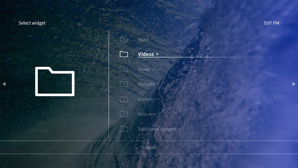 Nope, when I click on Select widget I get a list: None, Videos, Music, …