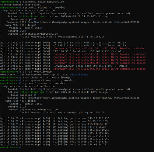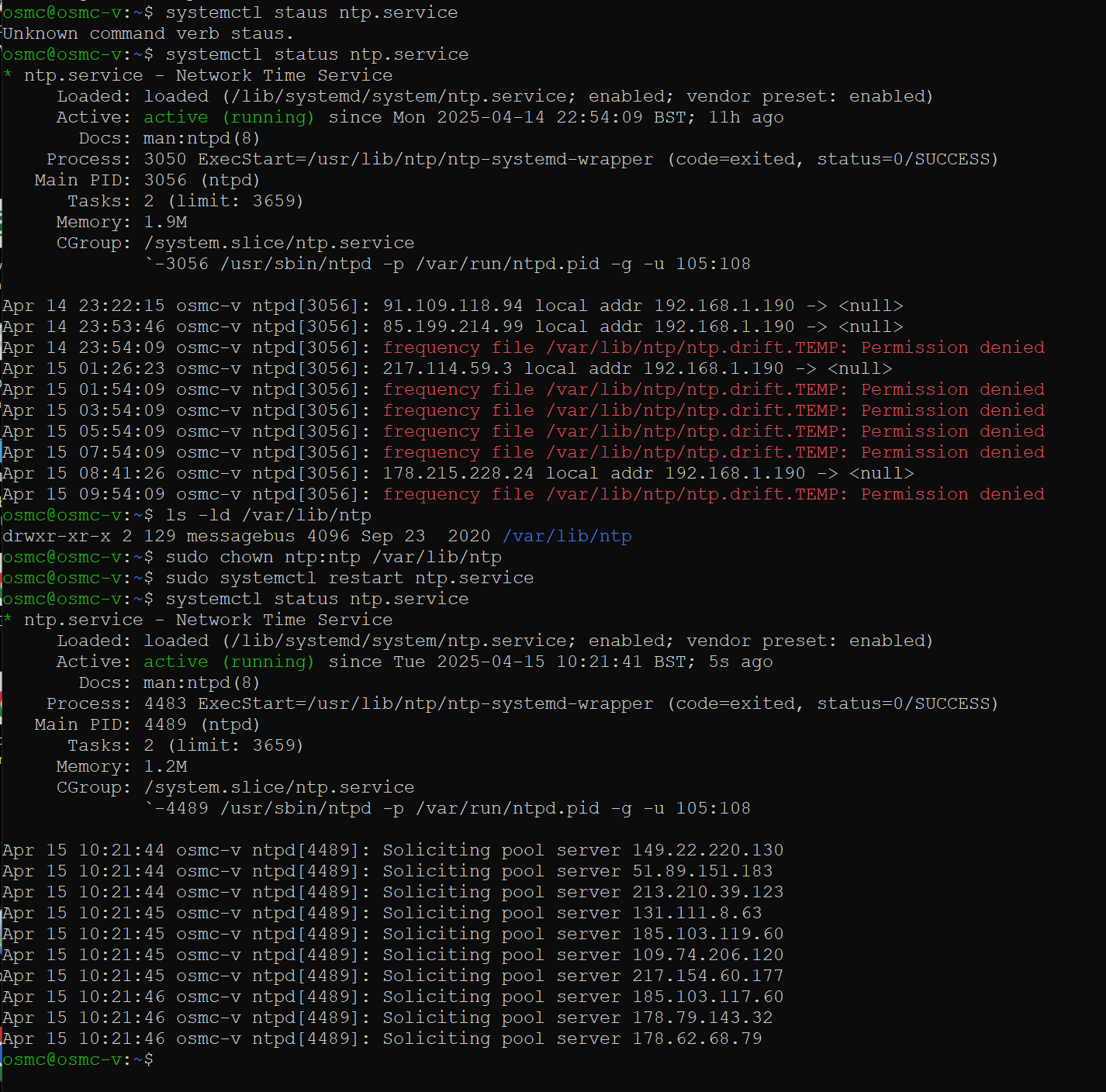 Seeing the same thing also, so corrected permissions. Looks like the install script for OSMC/Vero-V needs correcting, so as to set the correct permissions on /var/lib/ntp