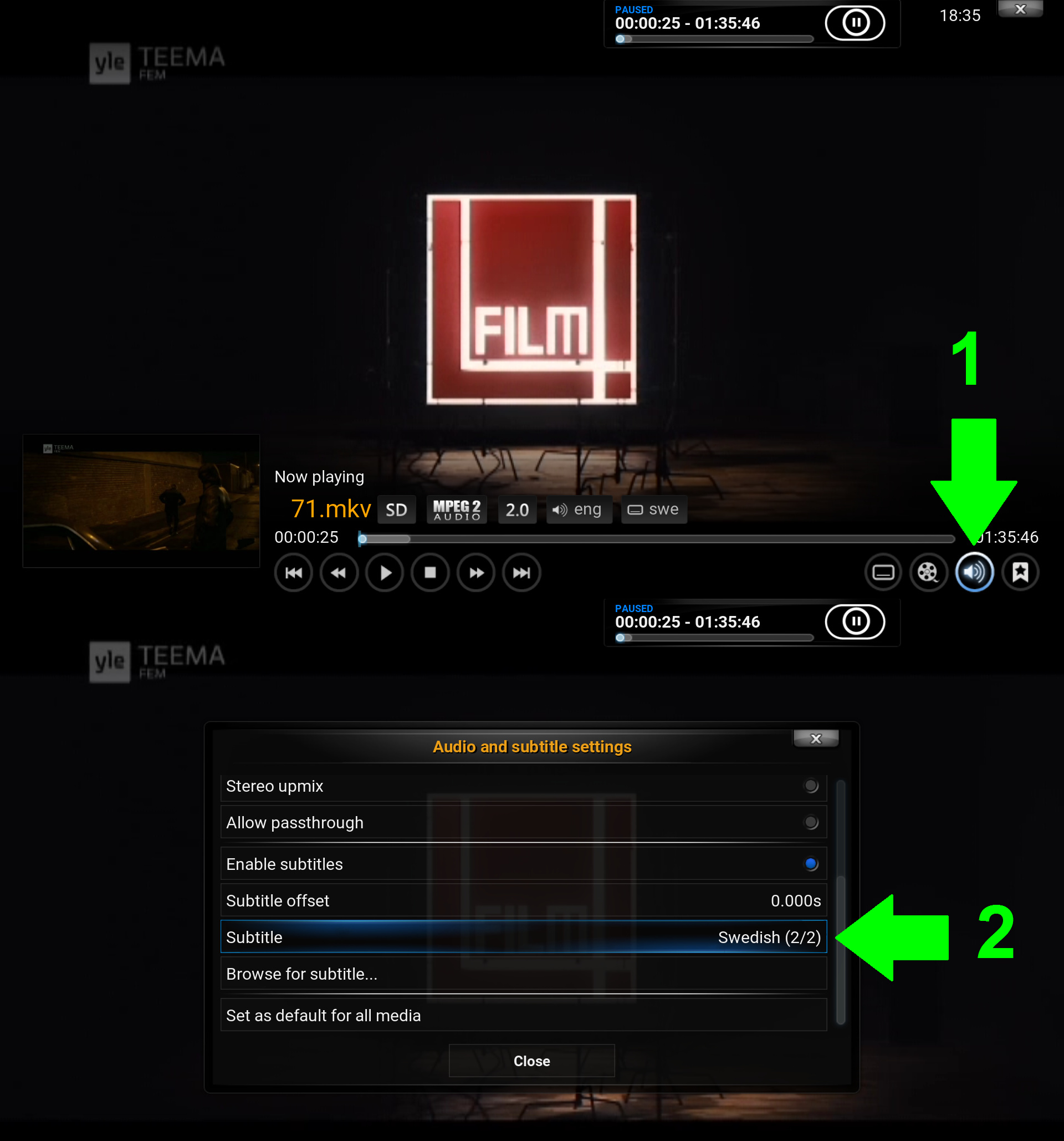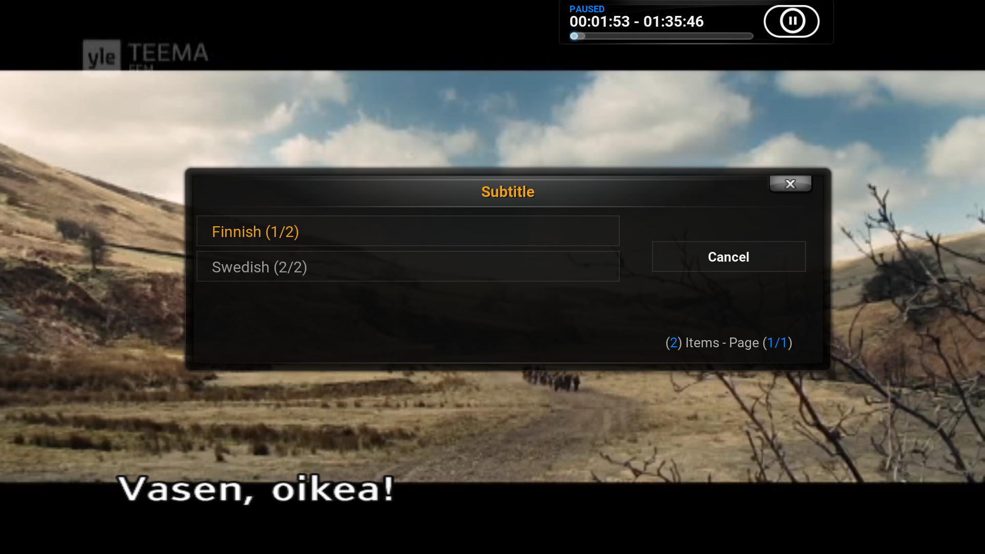 Odd… How did you go about getting that selection? I used the T hotkey and had only one selection, finnish or off. As we all speak Swedish here, we would rather have Swedish, bit in this case we quickly switched to TV instead as we were there when recording.